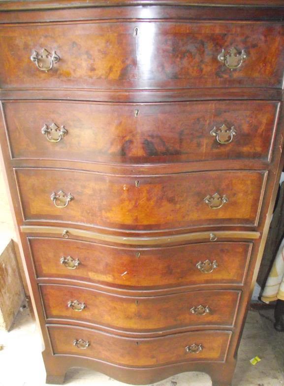 Set of burr walnut veneered serpentine front set of 6 draws with pull out writing slope