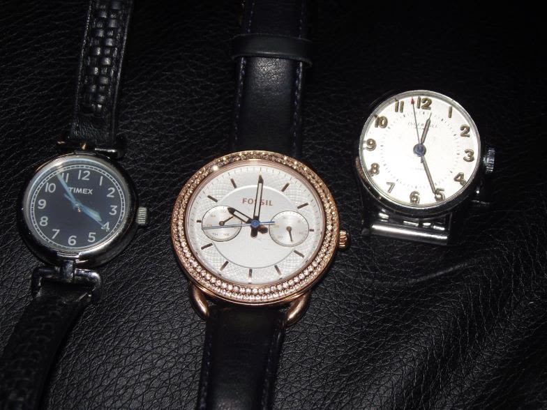 3x watches including ladies Fossil watch ( needs battery) old Timex working , Ingersoll nurses watch