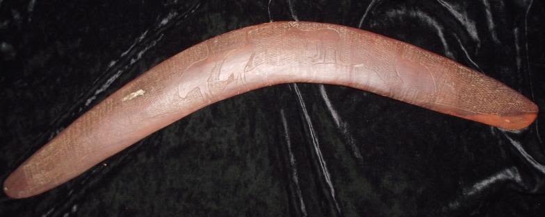 Vintage carved Marengo wood Aboriginal boomerang. Carved from one piece carved outlines of ostrich
