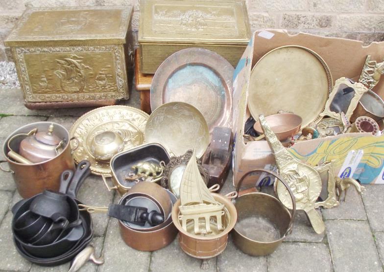 Large Selection of assorted brass wares inc trays + cast iron pans + old vintage wooden boat planes