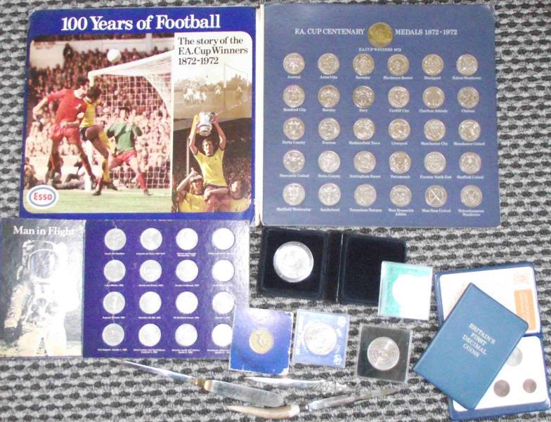 service Sheffield to Blackpool + selection of crowns + 1 sealed cased £5 coin + Esso football medals & Shell man in flight medal sets