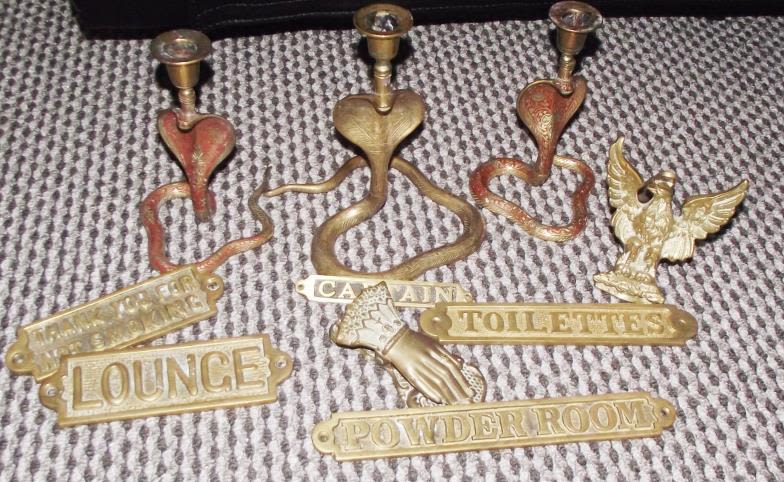 Collection of brass name plates inc Lounge , powder , Captain etc. + brass eagle door knocker + brass