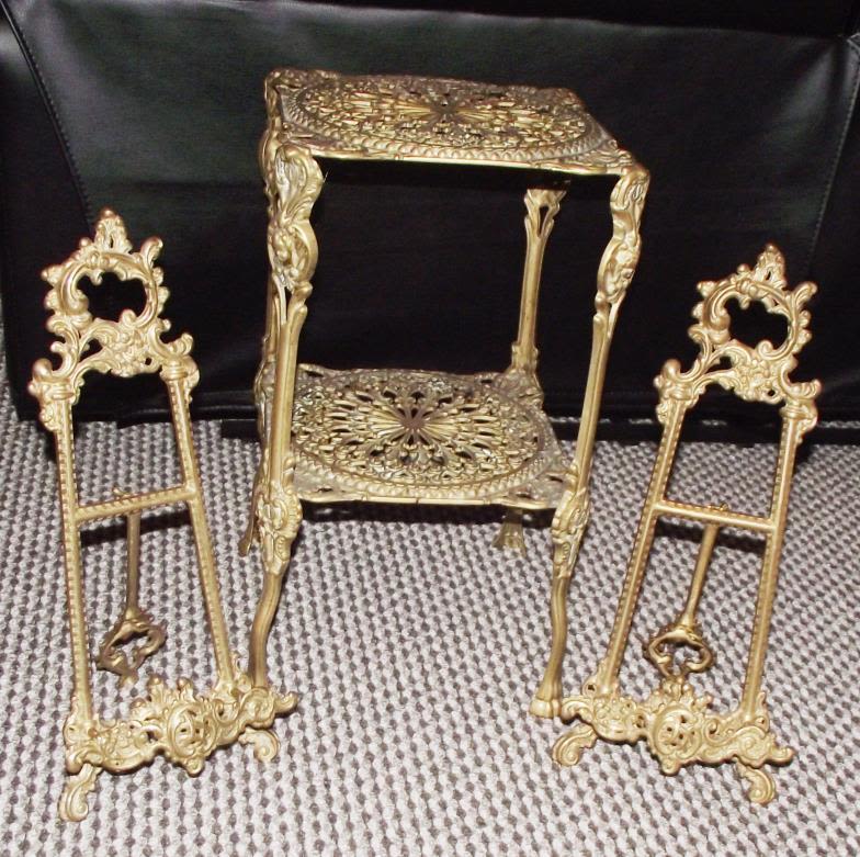 Large ornate brass 2 tier Trivet 17x10x10” + pair of ornate brass large picture frame stands 16” high