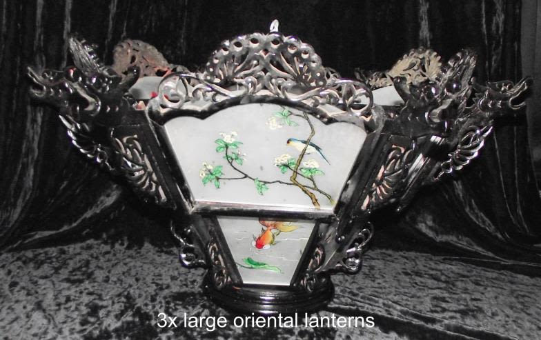 3 x large Chinese wooden framed and glass panel ceiling lanterns
