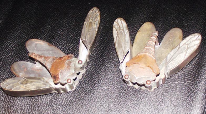 Pair of vintage brass and copper 7 white metal calligraphy ink wells in the form of winged locust with