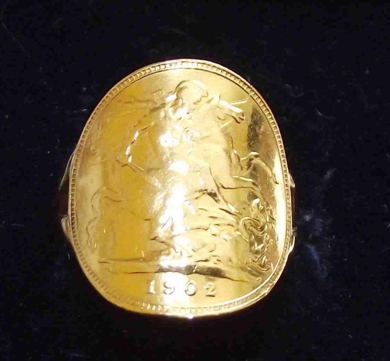 Gold sovereign ring . Sovereign been shaped to form top of ring . Unmarked shank due to ring being
