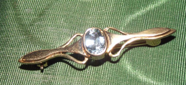 Art nouveau style fully hallmarked 9ct gold pin brooch with central aqua marine colour stone 3.4g