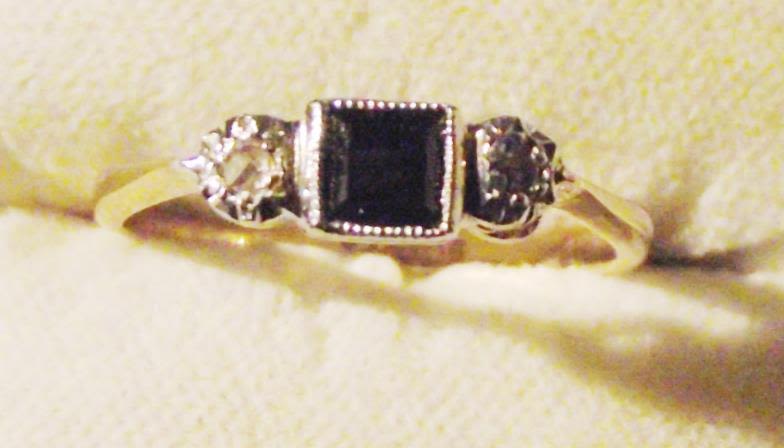 Nice ladies 9ct & platinum set ring with single diamond on each shoulder and a central square cut sapphire