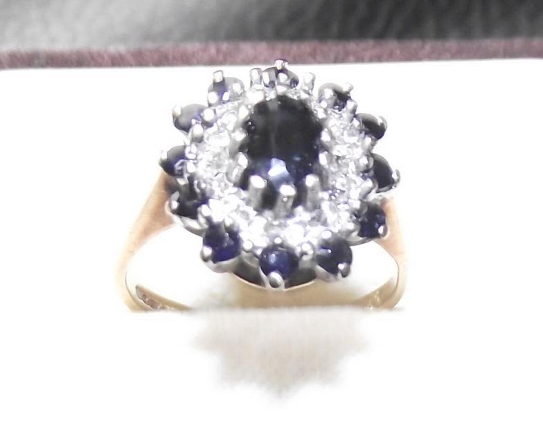 9ct gold fully hallmarked diamond and sapphire cluster ring size K 1/2 2.6g approx.