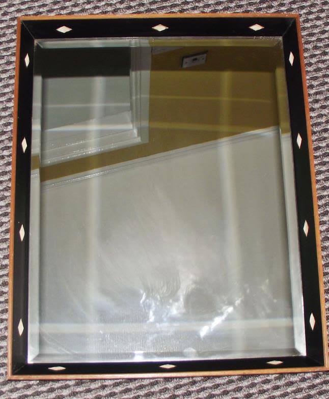 Vintage heavy Art deco bevel glass mirror in wooden frame. Interior of frame covered in leather type