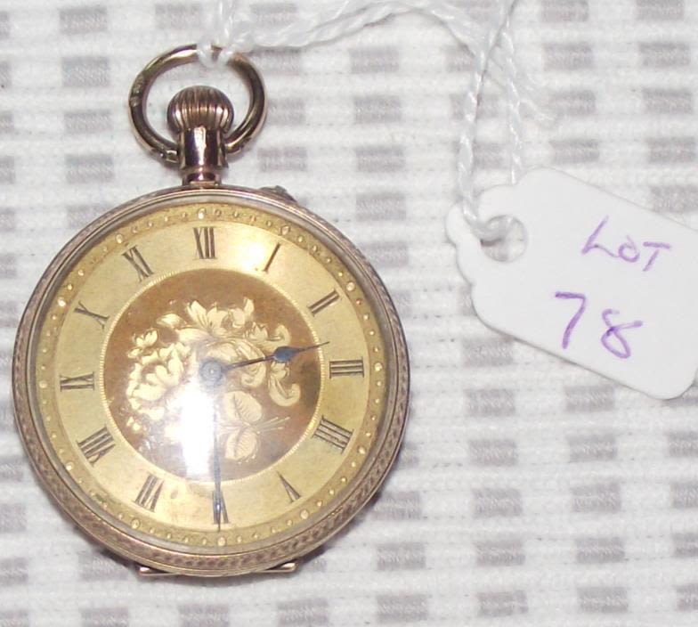 9ct Gold ladies pocket watch with design central panel engraved design back Working randomly start