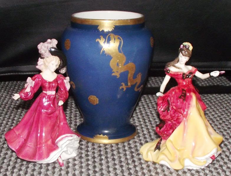 2 x Royal Doulton figure Belle HN 3703 & Patricia HN 3365 + oriental style blue and gold painted