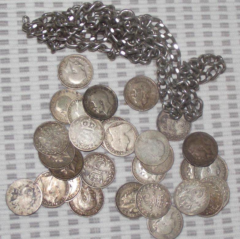 silver chain marked silver + 28 silver 3d coins all pre 1919 82.6 g approx