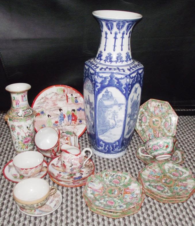 21 pieces of Asian/oriental pottery inc hexagonal plated cups , saucers cream jug +Large 20thC Oriental