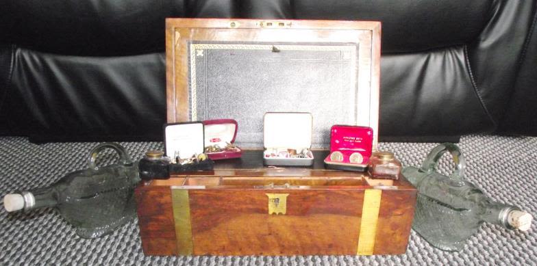 Large Antique burr walnut writing slope with original ink pots ( slight damage to leather top) +