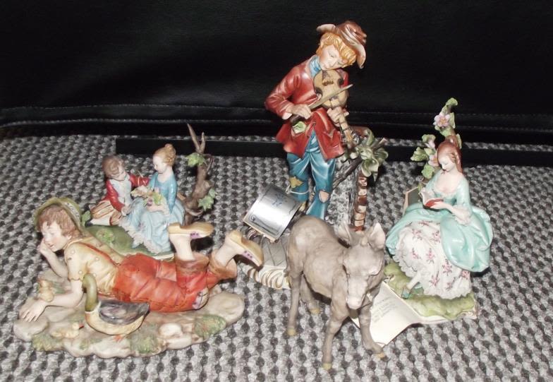 Kaiser porcelain figure of a donkey. Marked to underside. Measures 5 1/2" length x 6" height. + 4 Capodemonte