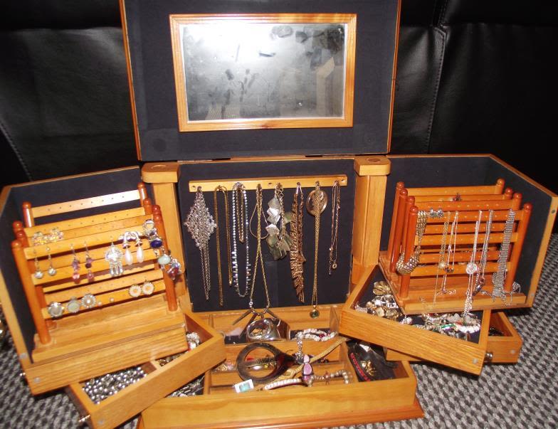 Good Large wooden tiered Jewellery box with mirror back full of lots assorted costume Jewellery inc