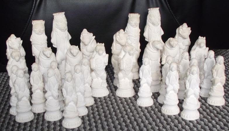 Good quality vintage full plaster moulded chess set Reynard The fox ( all unpainted figures ) with