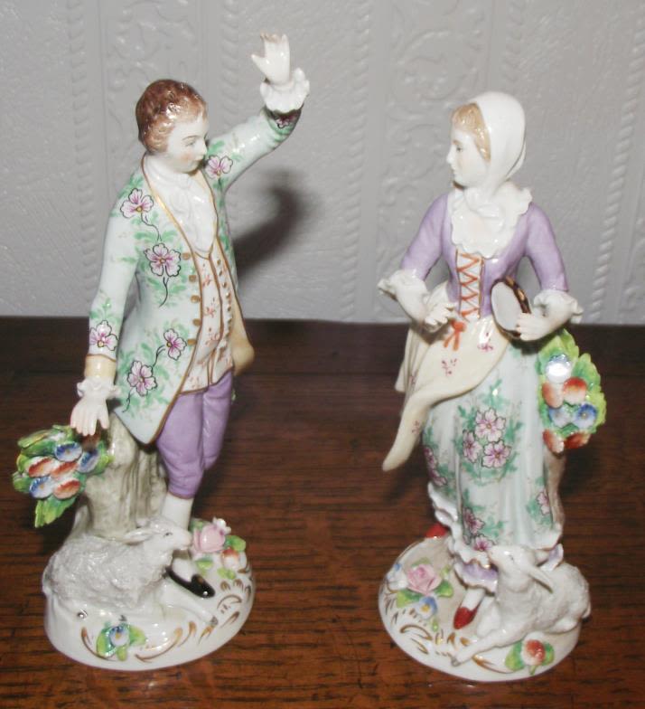 A pair of early 20thC Sitzendorf porcelain figures, a man and woman with lambs at their feet 7” tall