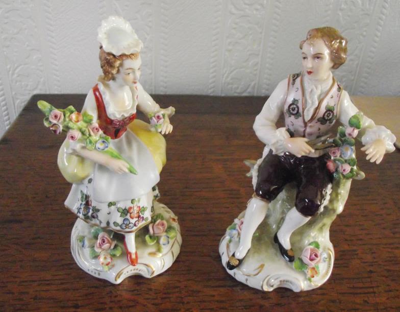Pair of late 19th early 20thc Sitzendorf figures Gentleman clipping a rose and a Lady holding bouquet