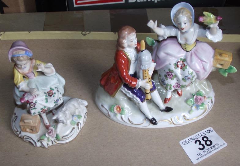 Scottish interest Rare Sitzendorf courting couple figurine with gentleman playing bagpipes + Sitzendorf