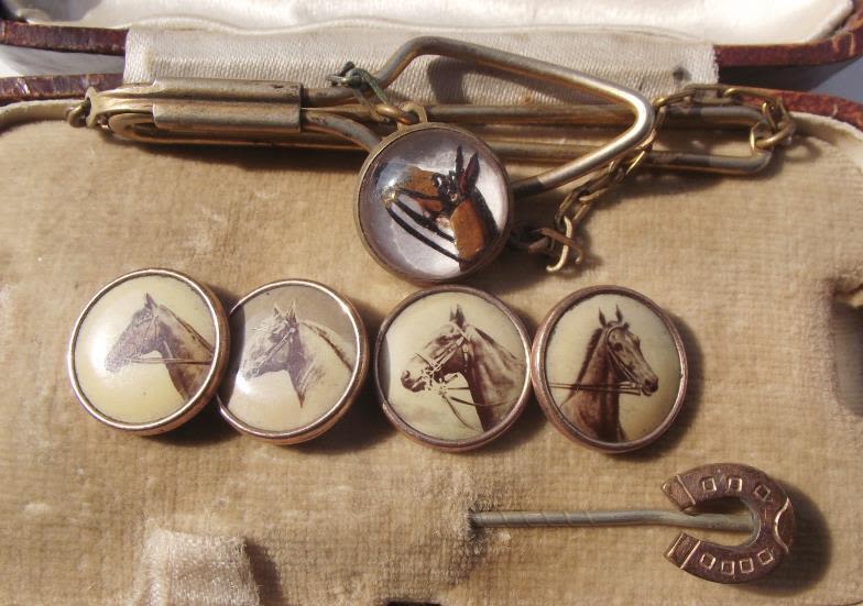 Set of 4 gilt metal cufflinks + Gilt metal tie slide depicting horses heads + gilt metal horse shoe