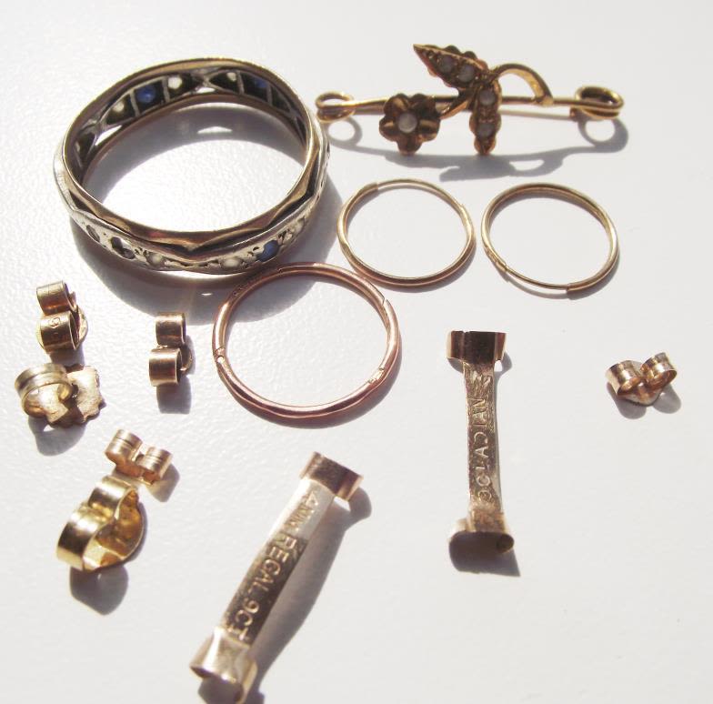 Small selection of 9ct gold items inc ring, pin brooch, ring sizes , earing back clips 3x hoop earrings