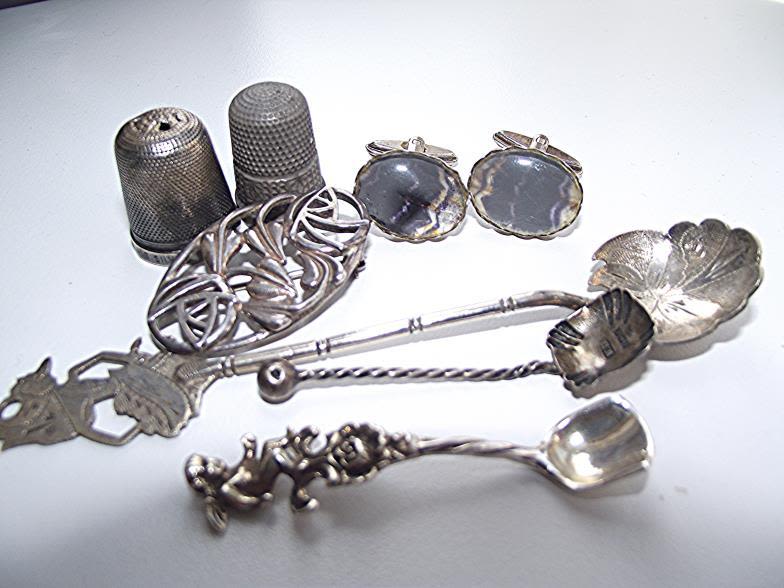 spoon , 2x silver thimbles , silver art Neaveau style brooch , pair silver cufflinks with Blue john setting , continental silver spoon marked 800 with griffin finial34g approx.