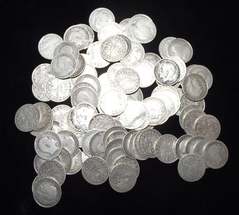 100 pre 1919 old silver 3d coins 135.5g approx.