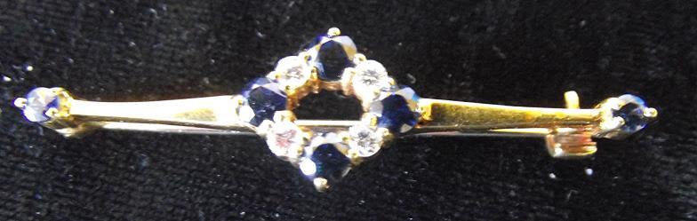 Small Quality 18ct gold pin brooch set with small sapphires on outer edge and 4 sapphires and 4 quality