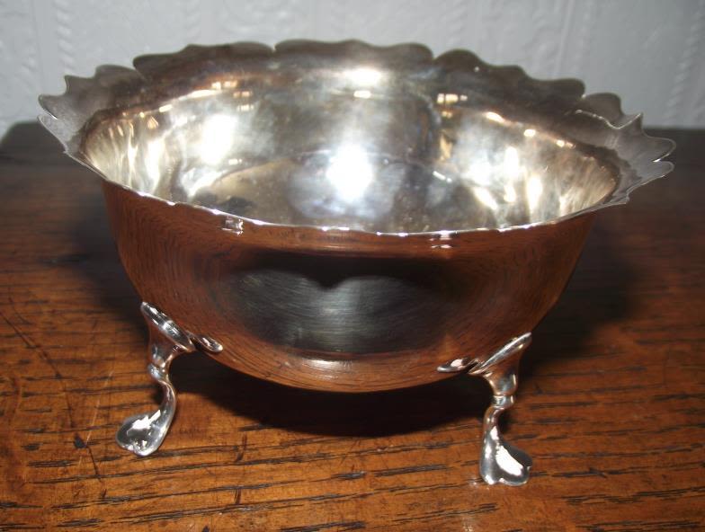 Solid silver sweet meat bowl with crimped scalloped edge Mappin & Webb London1894 raised on 3 splayed