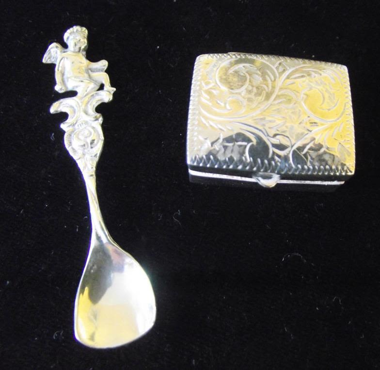 Small silver lidded style patch box + small silver salt spoon with cherub finial