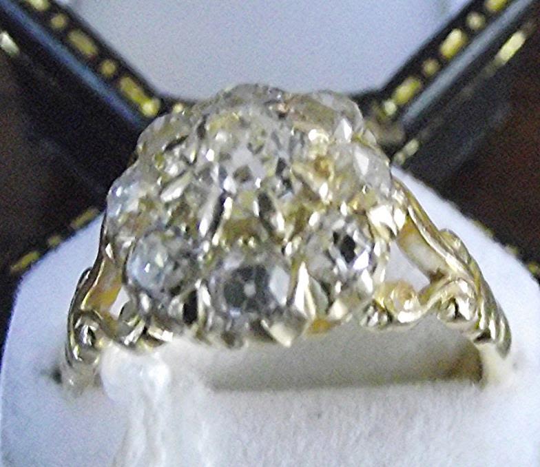 central stone surrounded with 9 smaller stones estimated 0.1ct each approx. mounted in a crown style setting with scroll mounts to the end of the shank marked 750 size J