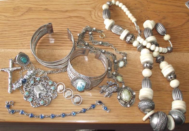 Small unusual lot of white metal Jewellery inc stone set bangles , ring unusual metal & bead necklace