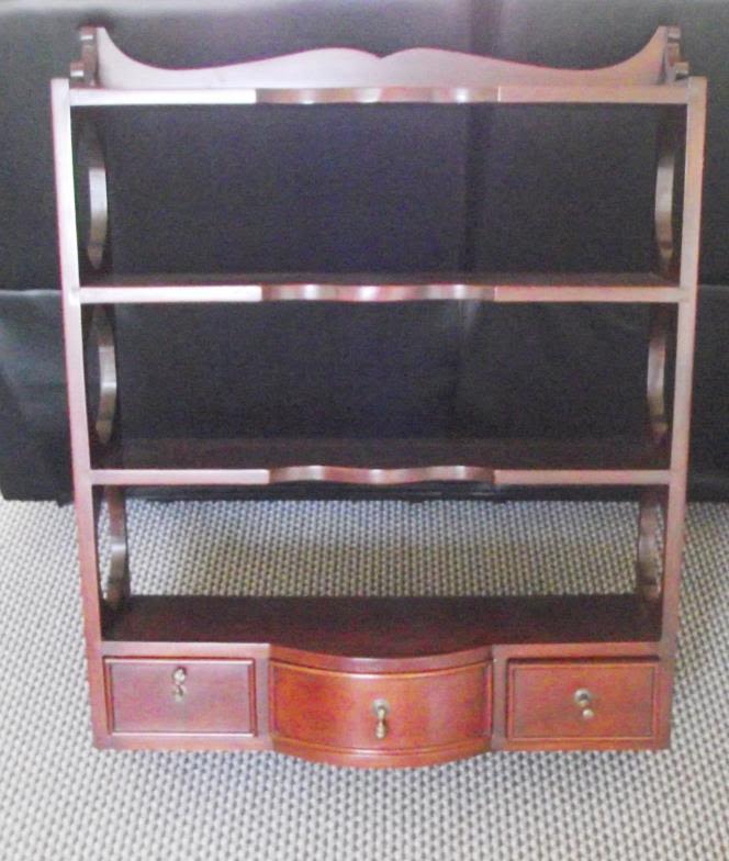 Quality Mahogany wall hanging display rack with 3 shaped shelves and shaped pediment with pierced
