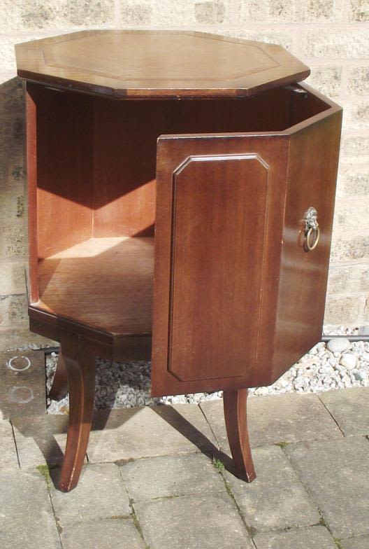 Small unusual circular wine cupboard with inlaid leather top insert & lion mask handle to door