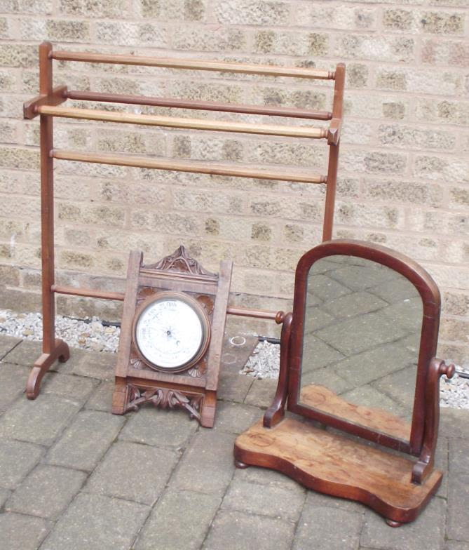 Good quality wooden bathroom rail + gentleman’s mahogany mirror + black forest wall hanging barometer