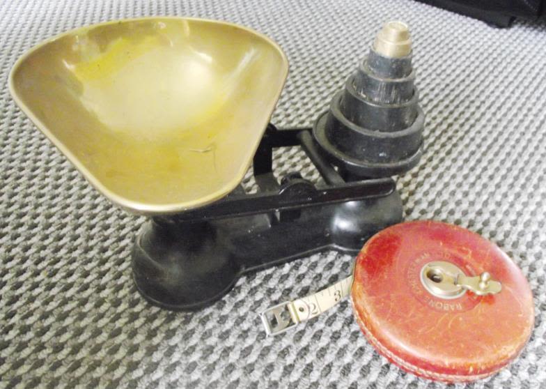 Set of Salter shop counter scales and weights + Vintage Rabone Chesterman leather cased 100ft measuring