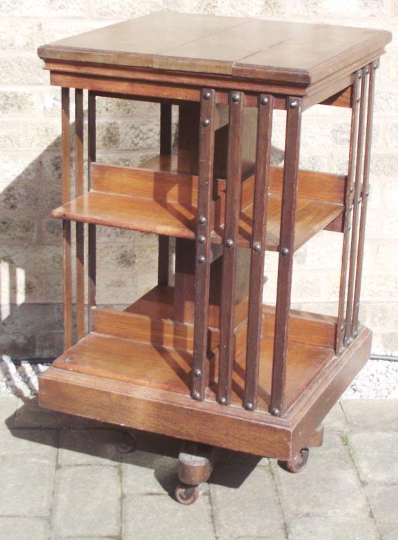 Edwardian style2 tier revolving bookcase raised on iron brackets onto wooden base with castors impressed
