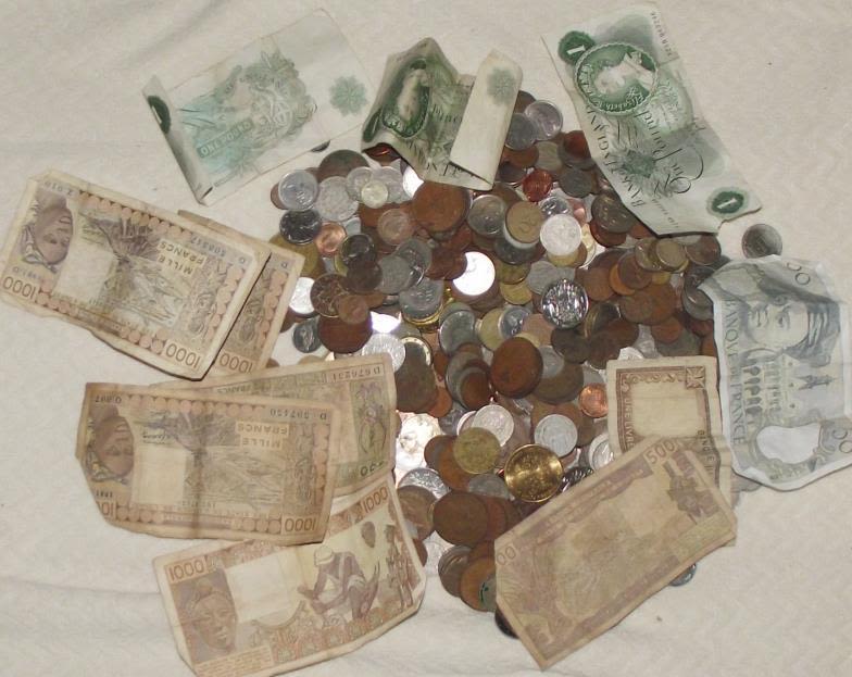 Large collection of assorted bank notes and coins from around the world inc British notes and coins