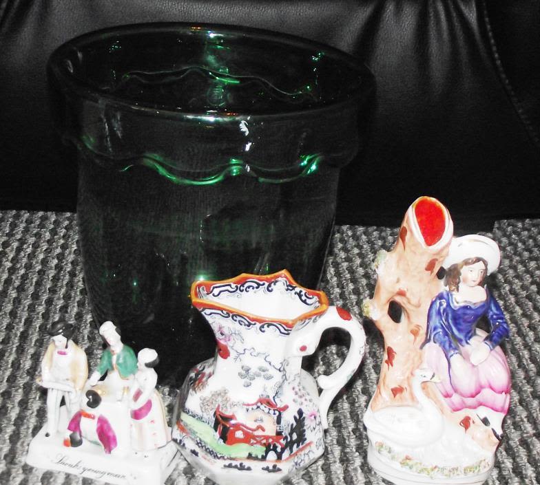 Antique Handmade green glass ice bucket with folded and crimped over lip +Unusual spill holder girl