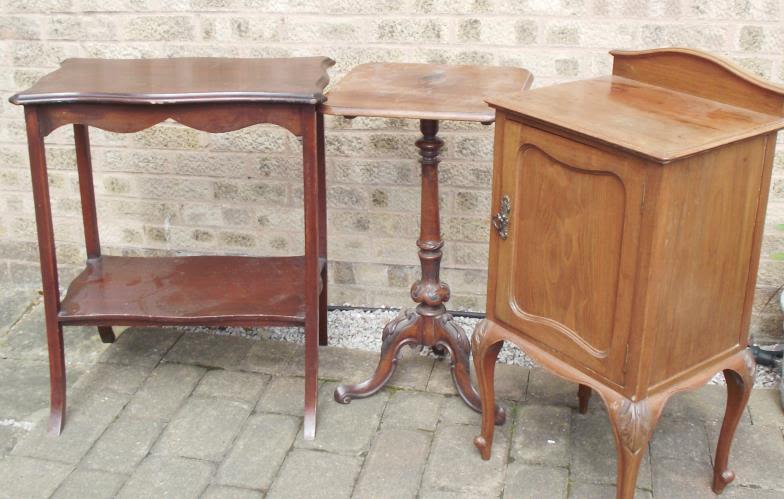 Edwardian 2 tier side table with out- swept legs + Oak bedside cabinet with raised back single door