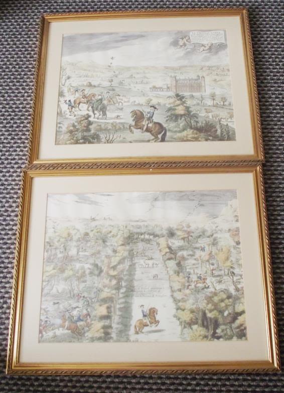 2x framed and glazed 18thc style tinted copper engravings depicting the art of dressage (Le chateau