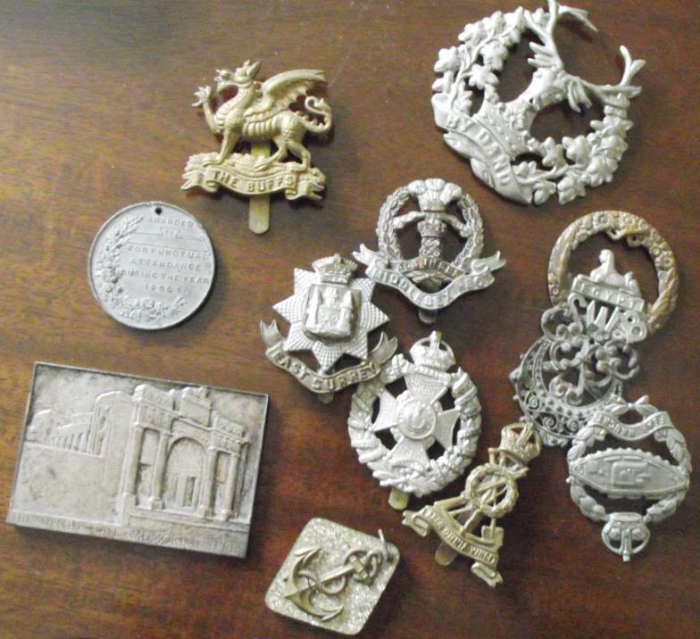 9 assorted various military and other cap badges + replica copy Menin gate Ypres plaque