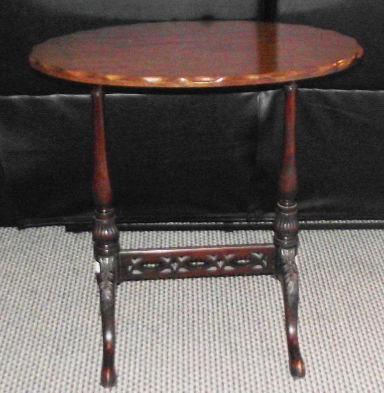 Quality mahogany pie crust top wine table raised on 2 column supports with pierced stretches carved