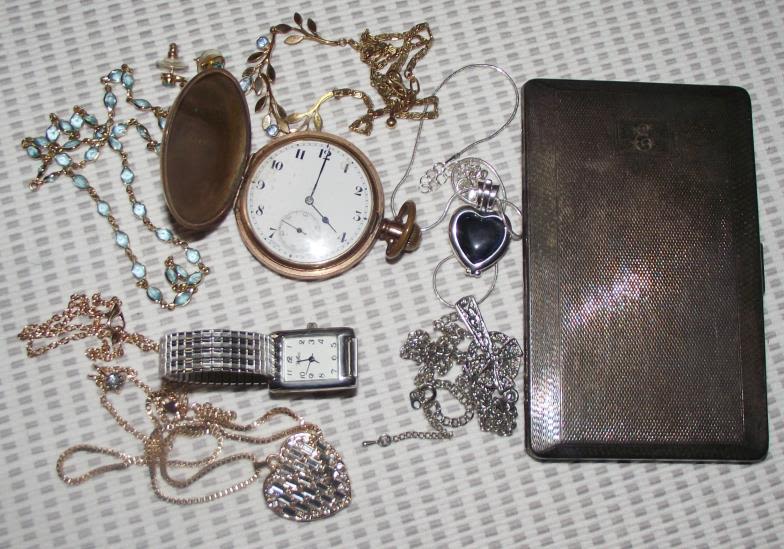 + gold plated gents Denison pocket watch ( not seen working)and stainless steel ravel ladies watch + Epns vintage cigarette case