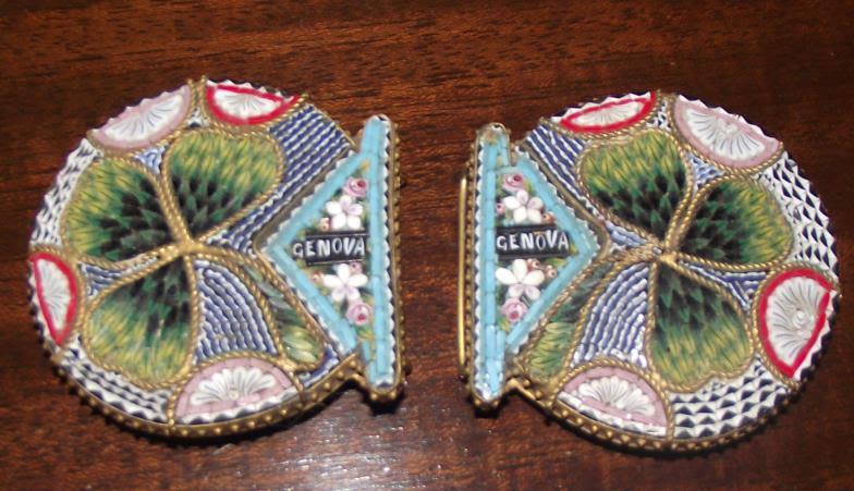 2x Rare vintage Italian Genova micro mosaic belt buckles with brass hook backs