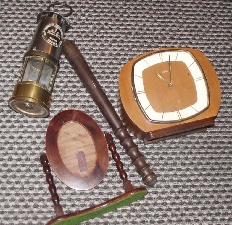 1960s Smiths mantle clock + 15” long truncheon + Eccles miner lamp + mahogany photo frame raised on