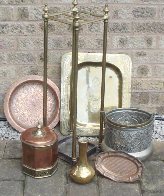 Nice quality brass stick stand with wrought iron base + selection of brass and copper ware trays etc