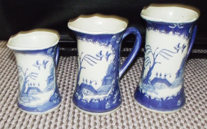 3 x graduated Vintage Chinese ‘DA QING DYNASTY QIANLONG’ Flow Blue Jugs